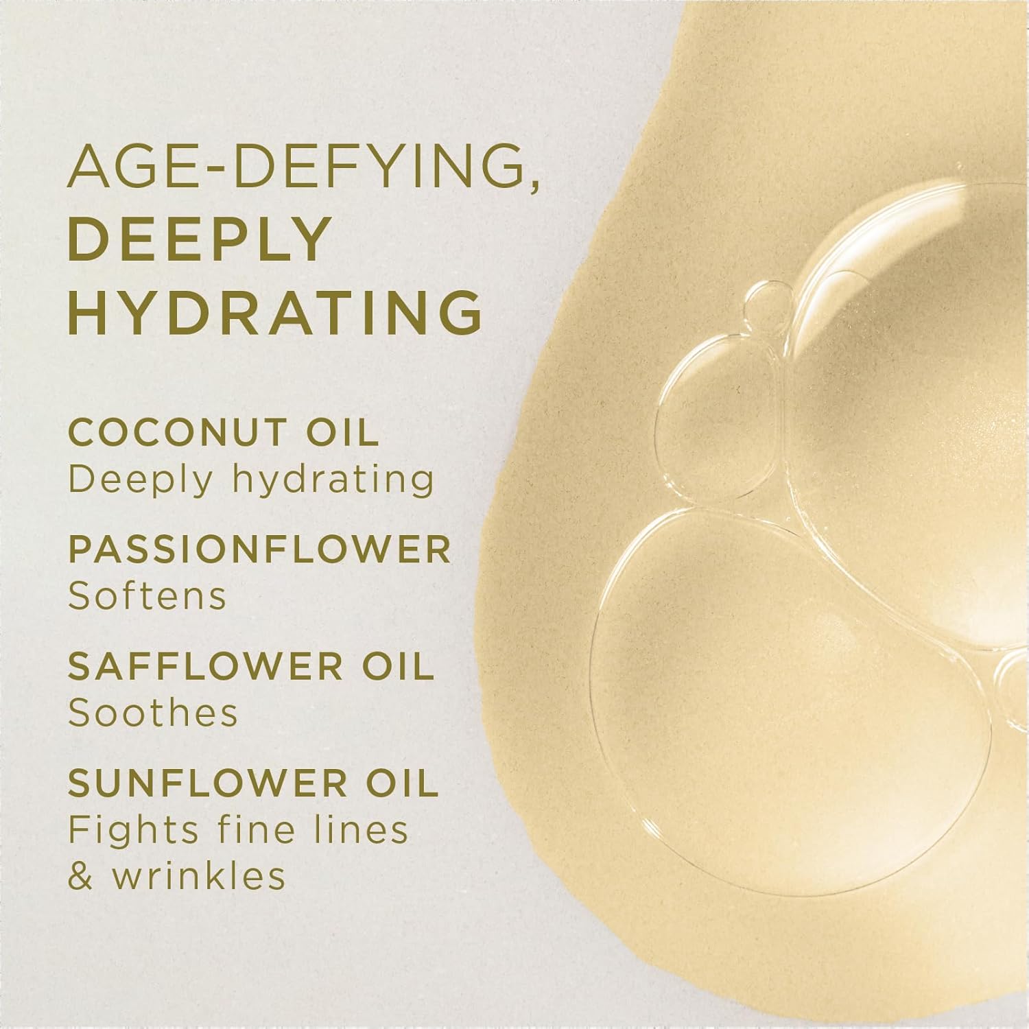 • NATURAL INGREDIENTS. Antioxidant-rich coconut oil and Vitamin E help prevent the signs of aging and promote skin-cell regeneration to minimize the appearance of wrinkles and improve the look of stretch marks. Sunflower and safflower oils offer soothing benefits that improve the texture and softness of the skin.