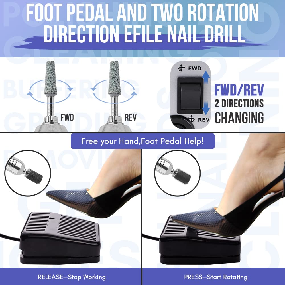 - Foot Pedal and Two Rotation Direction Efile Nail Drill: Two directions for left-hand and right-hand use. This nail files for acrylic nails is equipped with the F-Forward and R-Reverse buttons to change the direction of the rotating bit, which enables any right-handed or left-handed use. โHandโ mode and โFootโ mode for you to choose and better meet your requirement.