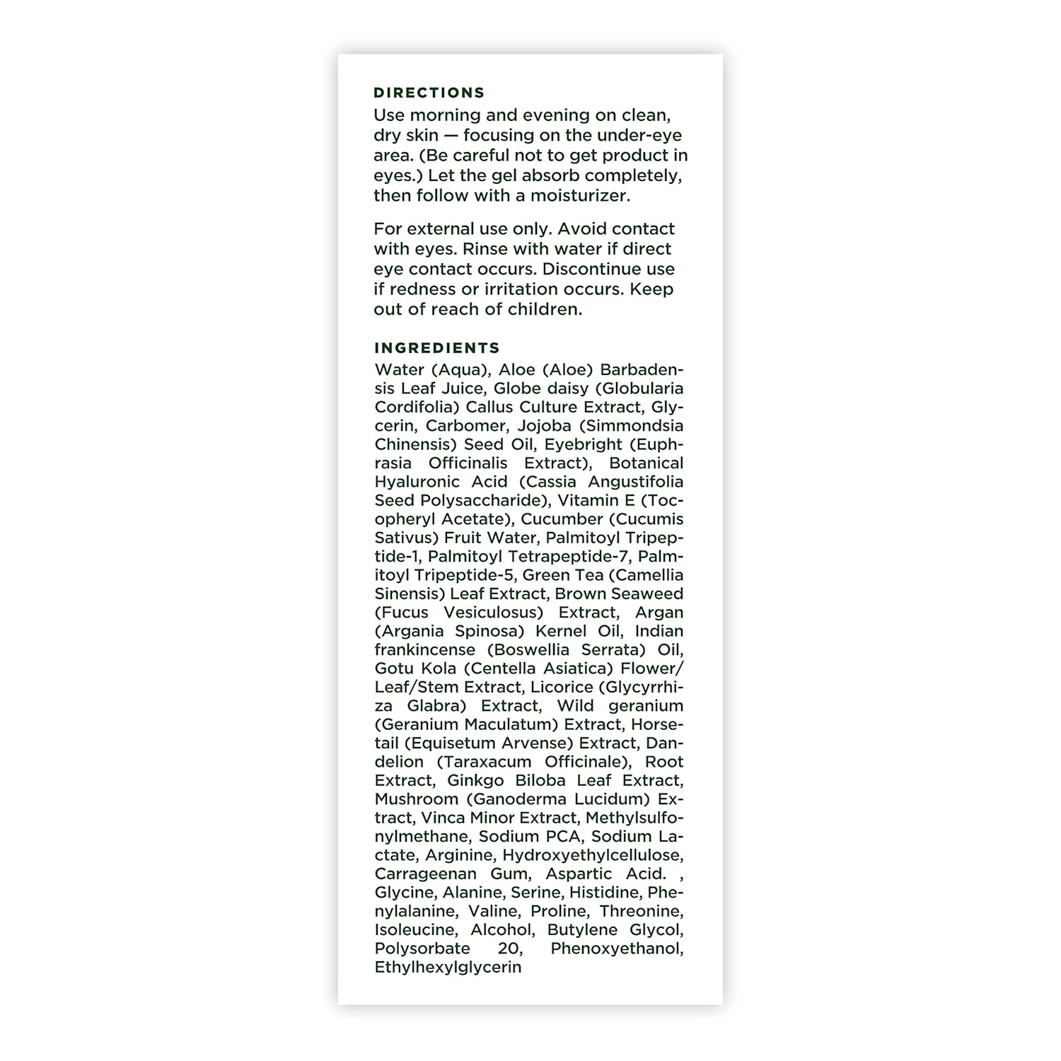 - Directions: Apply morning and evening on clean, dry skin β focusing on the under-eye area. (Be careful not to get product in eyes.) Let the gel absorb completely, then follow with a moisturizer.
