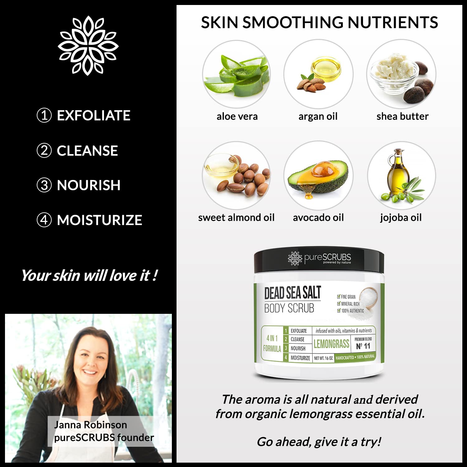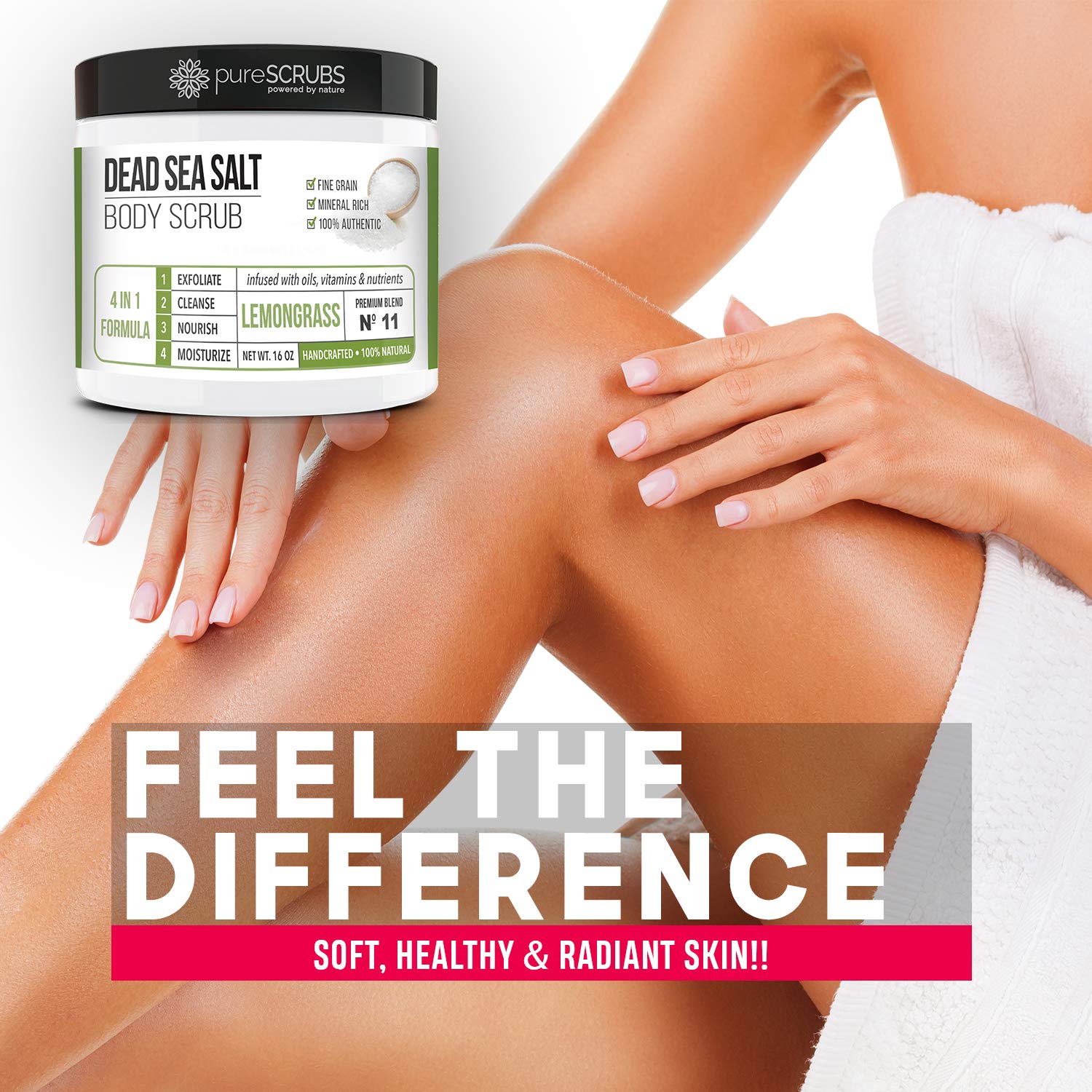 • GET ULTRA SMOOTH SKIN FAST - THIS WORKS! Our unique “4 in 1 Formula” does everything a body scrub should do and more - EXFOLIATE, CLEANSE, NOURISH & MOISTURIZE. Fine grain dead sea salt infused with essential oils, nutrients and skin softeners helps to smooth away rough, bumpy, and uneven textures to instantly reveal your true soft, healthy and radiant skin. You'll love the lemongrass aroma!