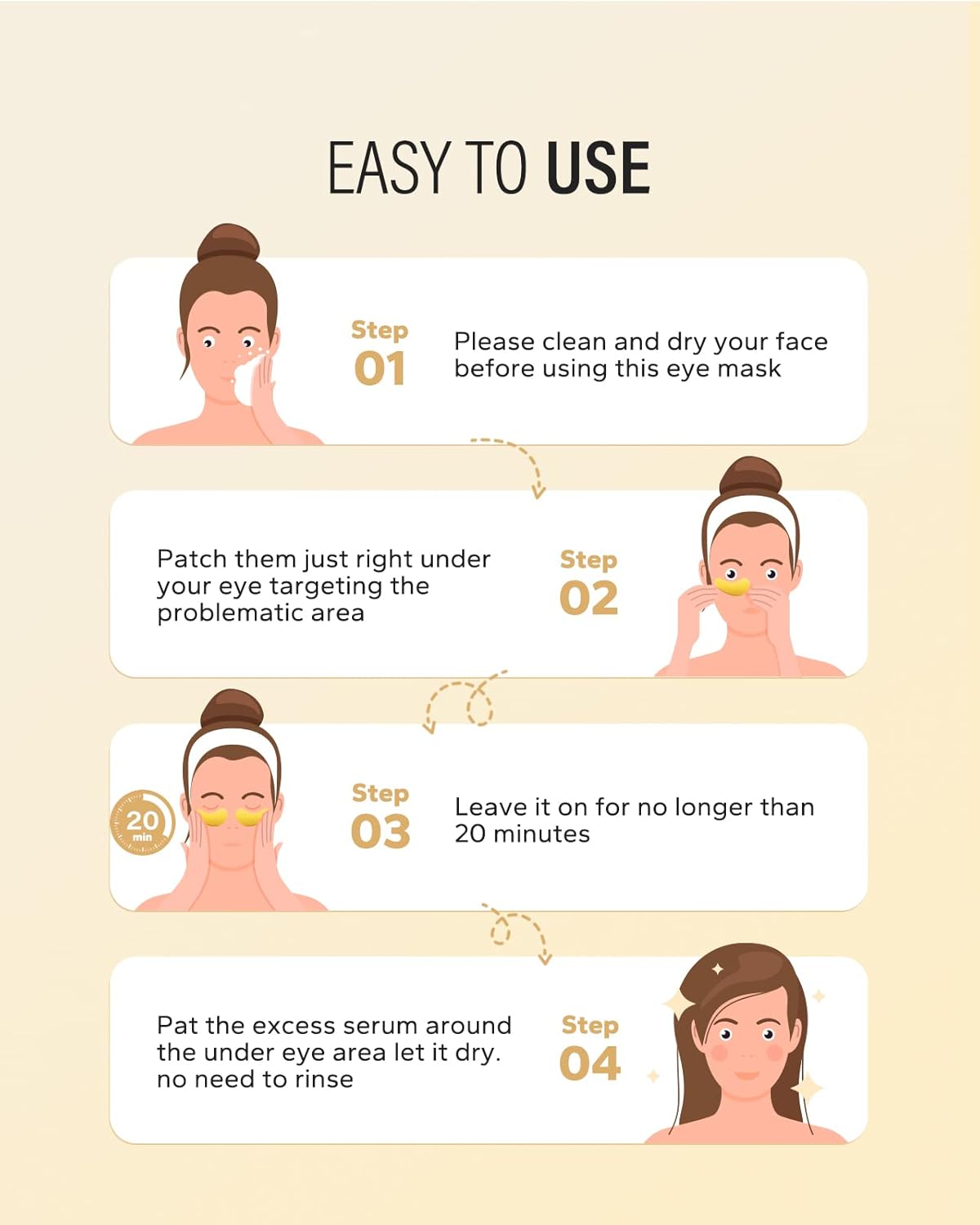 - Easy to Use: Clean your face and eyes with warm water, then put the eye patches under your eyes and press gently to secure them. Keep it for 20 minutes, and then remove the eye patches and gently pat the remaining essence. Twice a day or at least once a week.