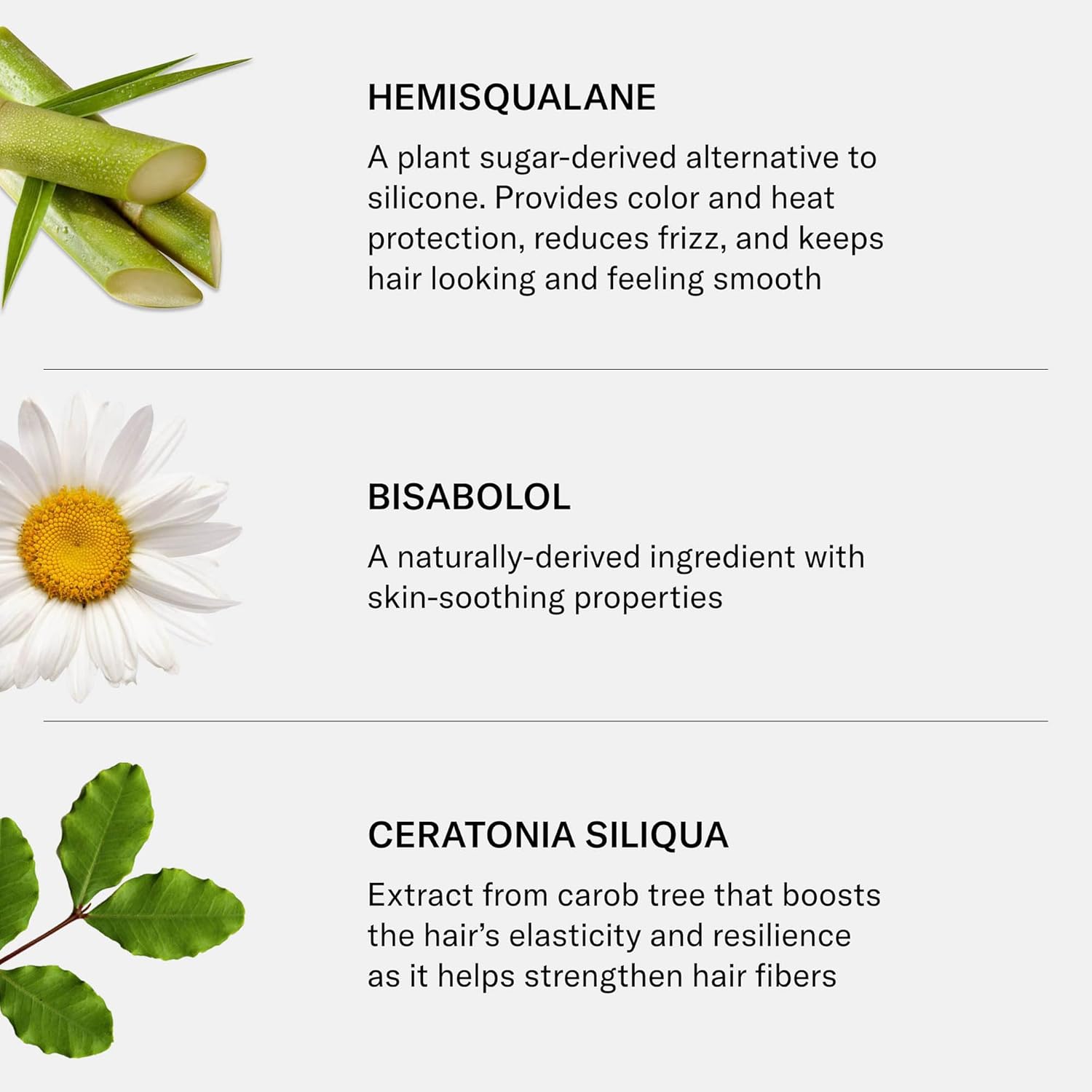 - Hero Ingredients: Hemisqualane β a plant sugar-derived alternative to silicone that provides color and heat protection, reduces frizz, and leaves hair smooth. Bisabolol β a naturally derived ingredient with skin-soothing benefits. Ceratonia Siliqua β carob tree extract that boosts elasticity and strengthens hair fibers. Moringa Oleifera β horseradish tree extract that shields hair from pollution and UV rays. Squalane β a plant-derived moisturizer that nourishes, restores luster, and adds shine.