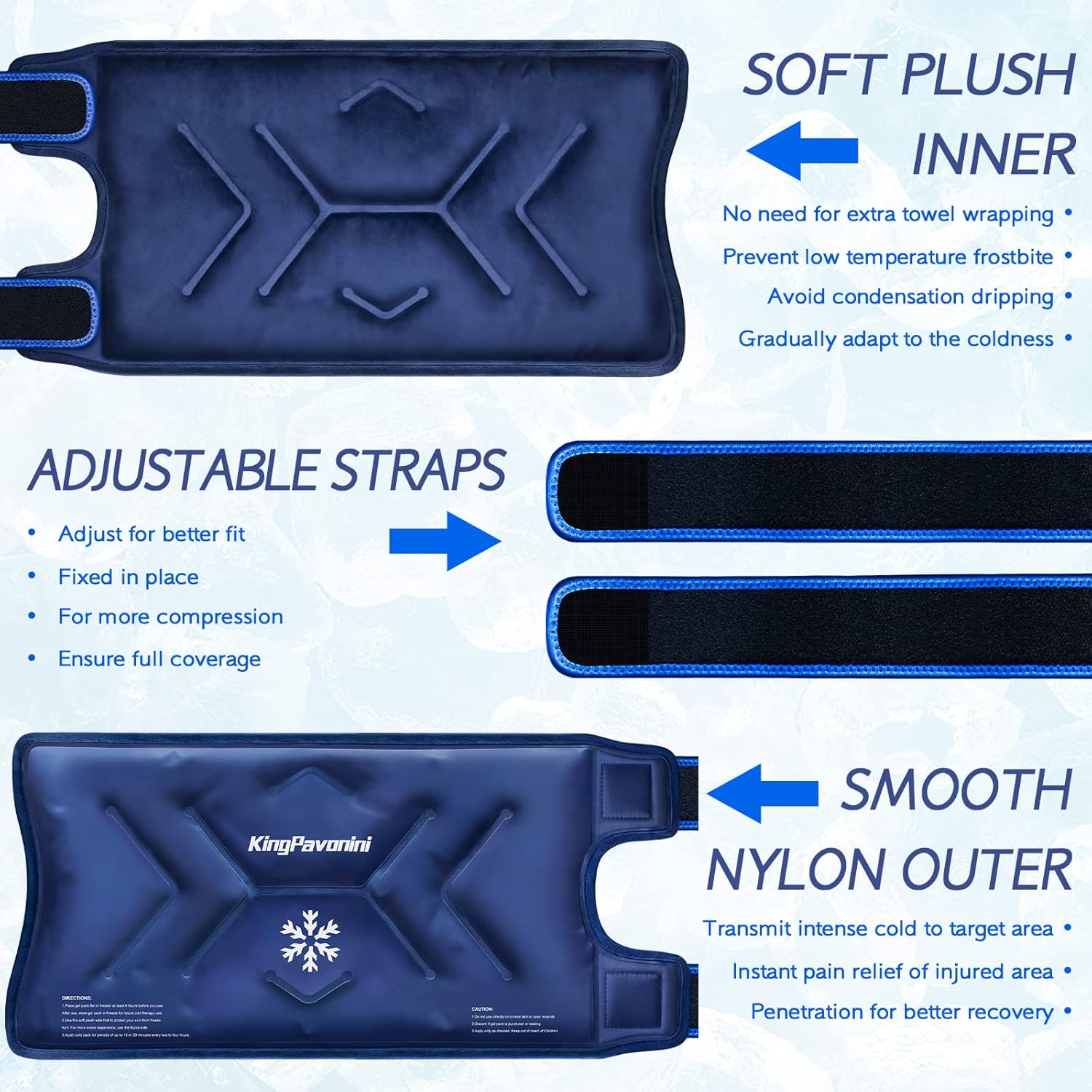 - 2 Levels Cold Therapy Effects: The plush side is soft to skin, which transmits soothing coldness to avoid condensation and frostbite without extra towel wrapping; The silky nylon side provides stronger coldness for quickly effective pain relief. It is recommended to use the plush side in the first few minutes to help the skin gradually adapt to the cold.