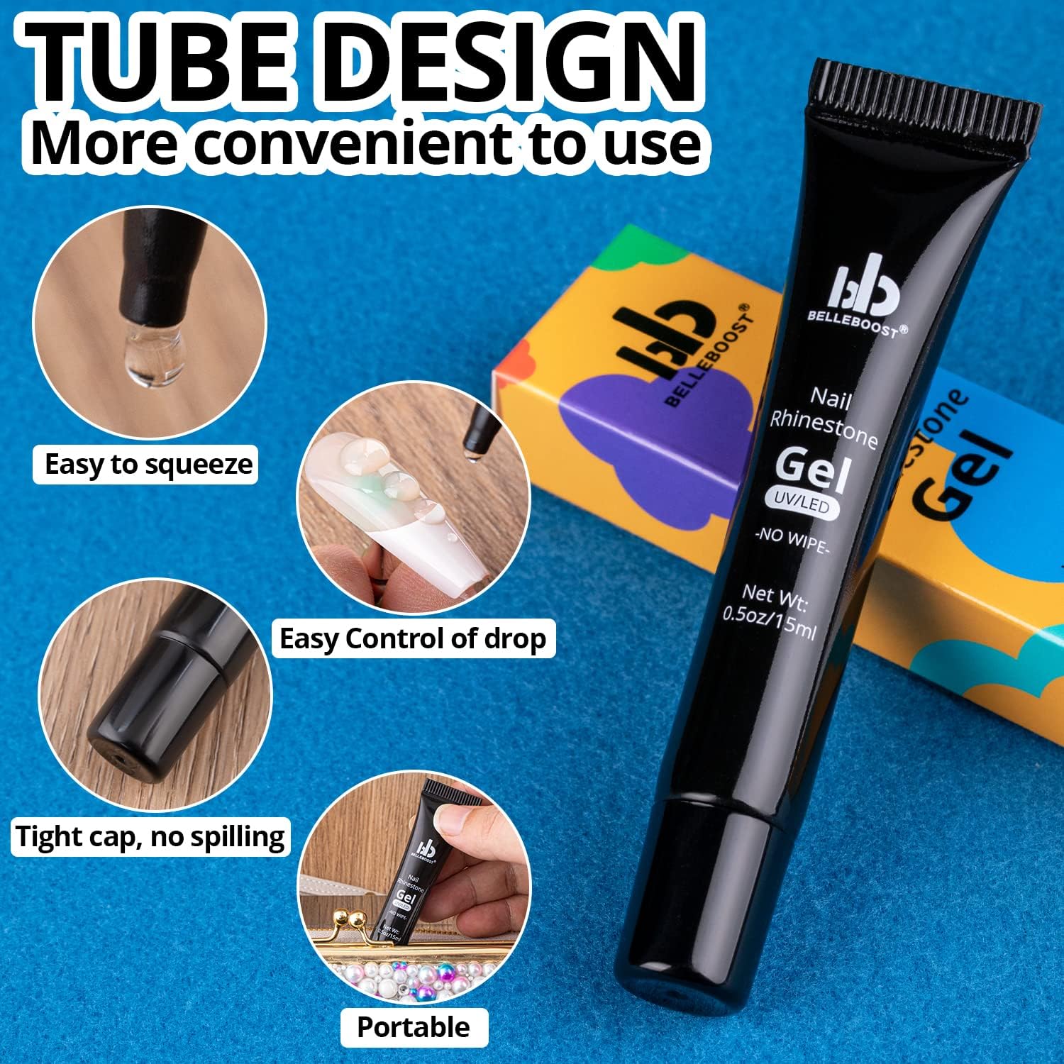 - 💎NO WIPE TUBE DESIGN GLUE: For your better experience for nail art decoration, the tube glue gel is very easy to squeeze and dot directly to the place you want to stick gems with no mess. It is easy to control the amout for sticking both big and small stones. This nail glue gel is much easier to carry and store with no leakage.