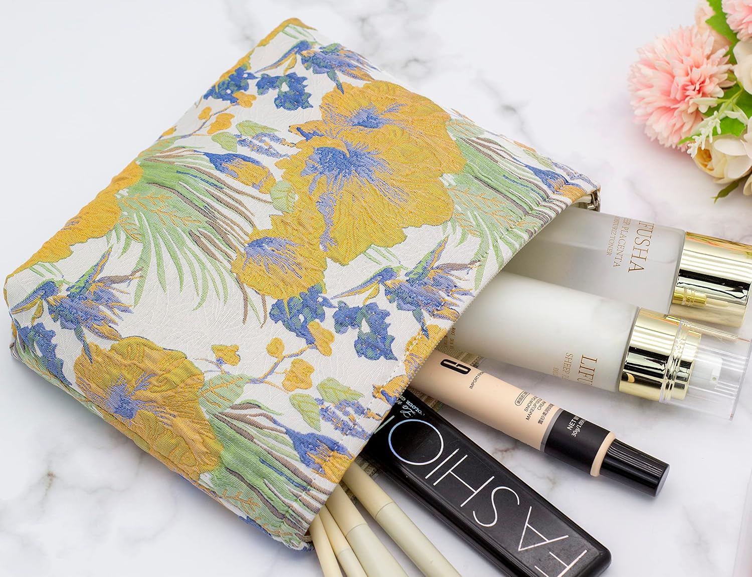 Makeup Bags for Purse Zipper Cosmetic Pouch Large Travel Canvas Make Up Organizer Tool Pouch for Women and Girls,Brocade Flower Yellow