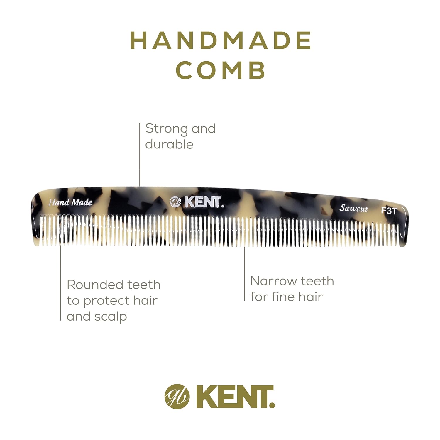 Kent F3T TW Fine Tooth Comb - Hair Parting and Straightening Comb for Men's & Women's Dandruff Remover, Saw Cut and Hand Polished Made in England