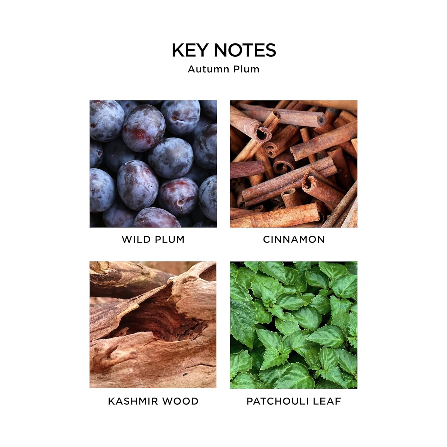 - WARM & SPICY - Wild plum and cinnamon are wrapped in the warmth of patchouli leaf and cashmere wood to capture the sweet, woody aroma of freshly fallen autumn leaves.