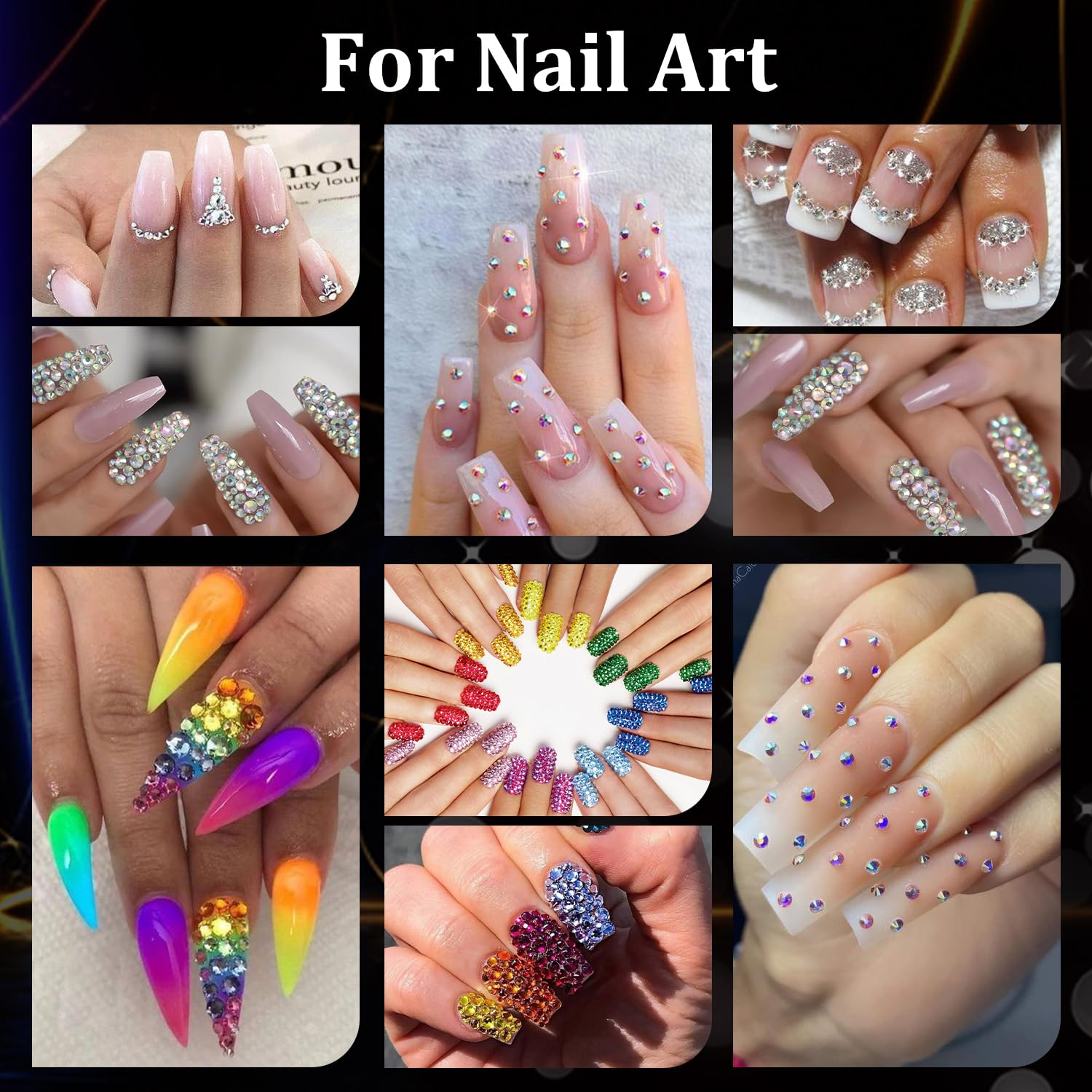 • 💎SPARKLING BRILLIANCE FOR ALL -- The dazzling nail stones can decorate natural or acrylic nails, suitable for nail art beginners, hobbyists, nail tech, and professional manicure salons. We offer a wide size range, from 2mm to 5mm, that is perfect for your DIY nail art projects. You can get creative nail art shapes and patterns by mixing sizes and colors. Besides, the gems can be also used for eye or face makeup and crafting, such as bedazzling clothes, shoes, tumblers, and cards.