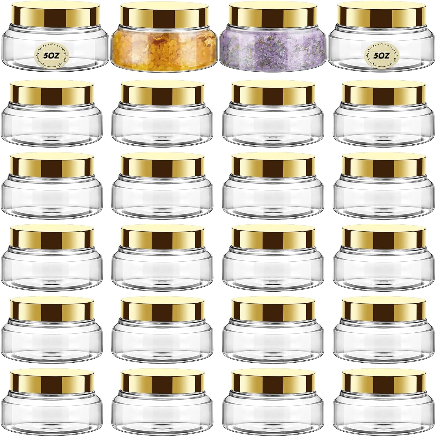Tessco 24 Pack Plastic Jars with Lids Labels Empty Clear Plastic Jars Round Refillable Cosmetic Containers Body Butter Containers Bulk Sugar Scrub Bottle for Make Up(5 oz,Gold)