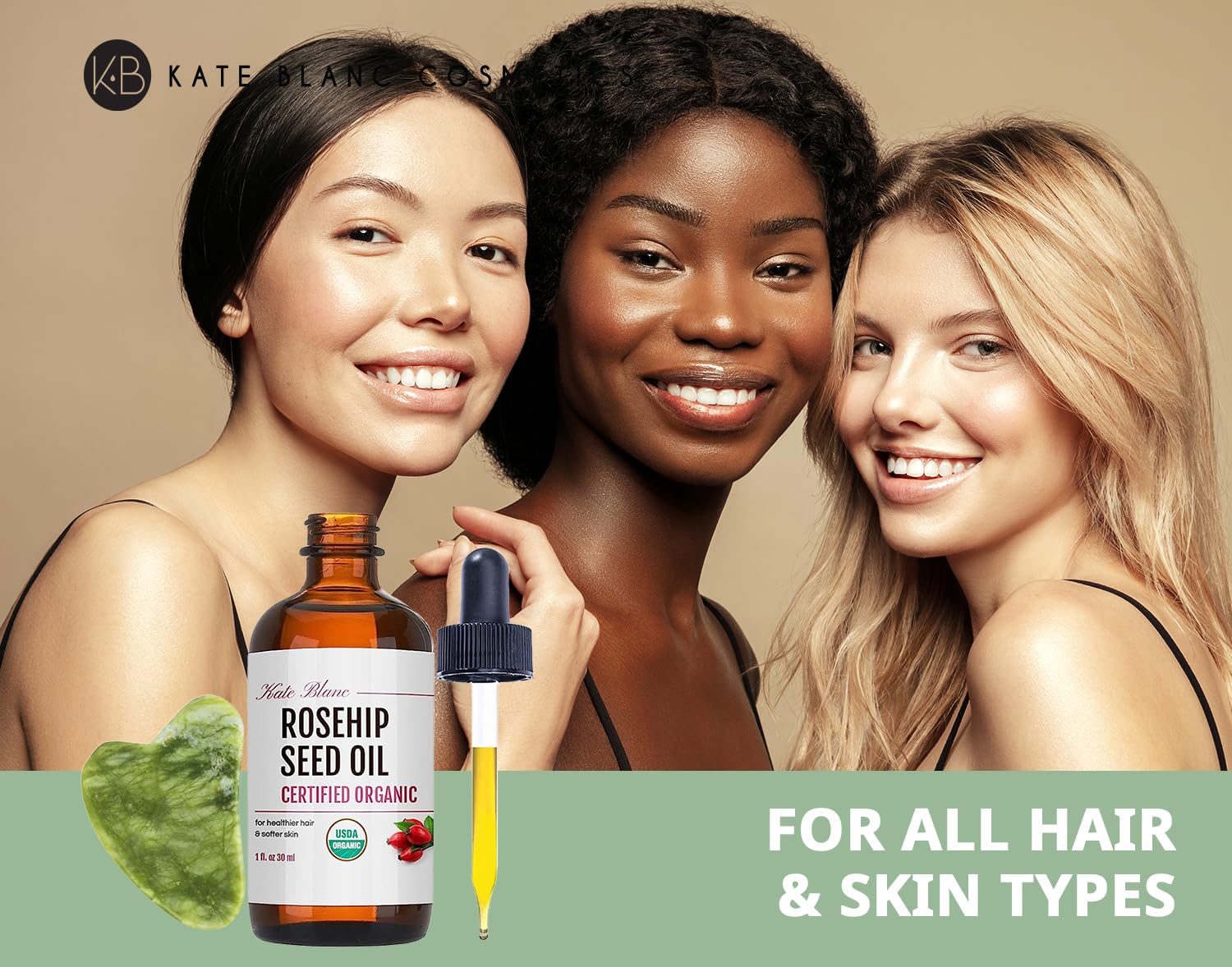 Kate Blanc Cosmetics Rosehip Oil for Face with Jade Gua Sha Stone (1oz, Organic, Pure, Cold Pressed) Rosehip Seed Face Oil for Gua Sha Massage