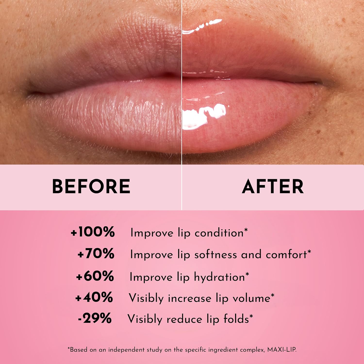 - Key Active Ingredients: Formulated with MAXI-LIP, a natural peptide complex that stimulates collagen synthesis via Hyaluronic Acid. Our gloss deeply moisturizes and firms the lips, making them appear bigger, smoother, and more defined. Enriched with Shea Butter to hydrate and soothe the lips, and Rosehip Oil to make them pillowy soft.