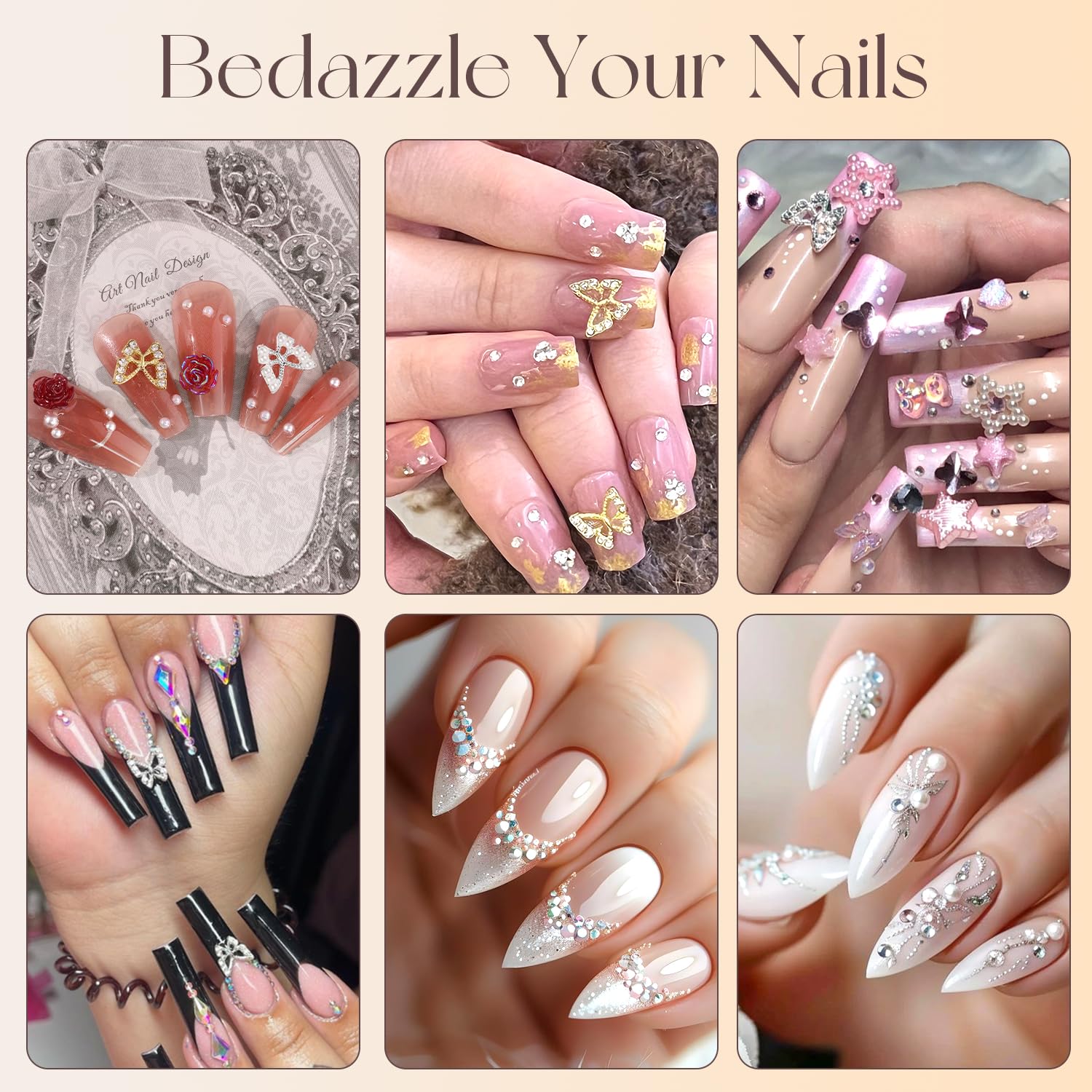 - ✨Wide Application -- Our sparkling nail charms not only can be used for nail art decor, but also can be applied to decorate your clothes, computers, phones, shoes, bags, craft, guitars, hats, hair clips and so on. Bedazzle your life.