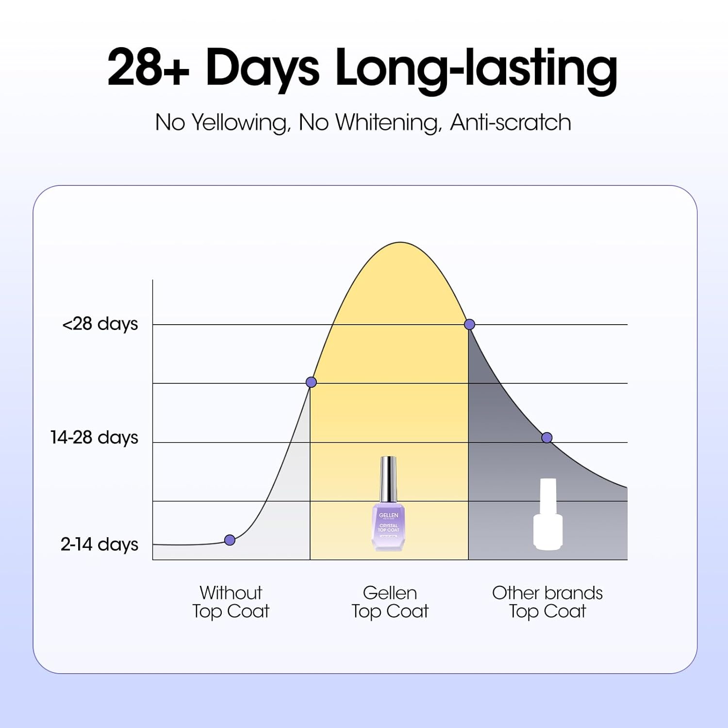 - ăEnhanced Anti-scratch Enhanced Crystal Gel Top Coată: Formulated with active polymers featuring a dense molecular structure, this 18ml Gellen top coat offers water resistance, robustness, and anti-scratch properties. The protective layer effectively enhances nail hardness and abrasion resistance, ensuring worry-free protection against scratches.