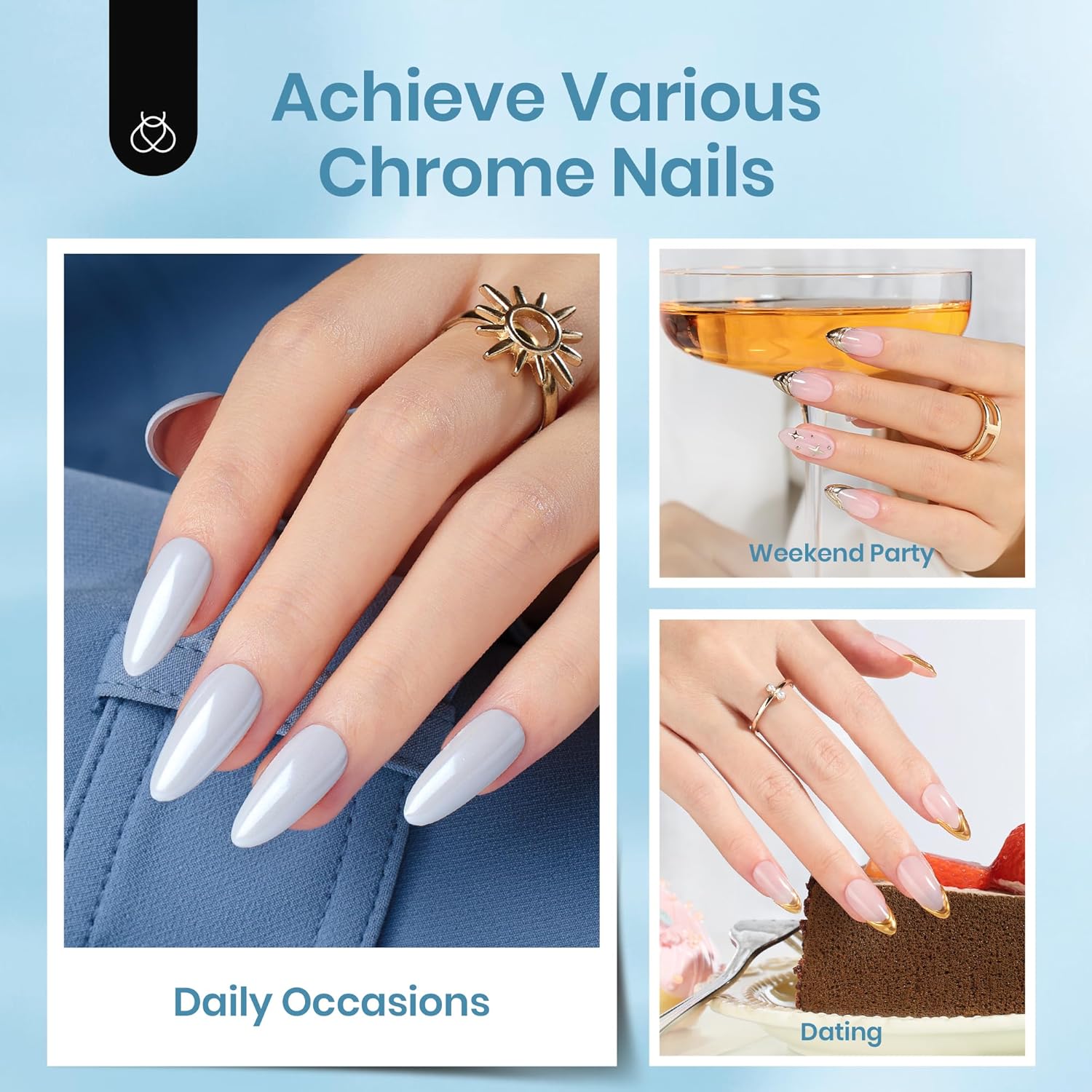 • Easy to Use: Simply apply the wipe-free gel topcoat to the base color, cure under the LED UV lamp for 30 seconds, and then apply your favorite chrome or pearl powder. Finally, seal with a topcoat and cure under the lamp for 60 seconds to complete the look. You can apply powder repeatedly. If you are not satisfied with the style after applying powder, you can wipe it off with alcohol and then apply powder again!