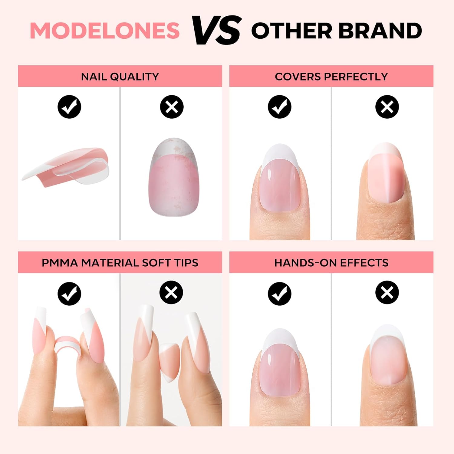- PMMA Soft Material: These premium French nails tip feature flexible yet durable PMMA soft gel material with a pre-designed curvature that seamlessly blends with your natural nail shape for a flawless, salon-quality finish.