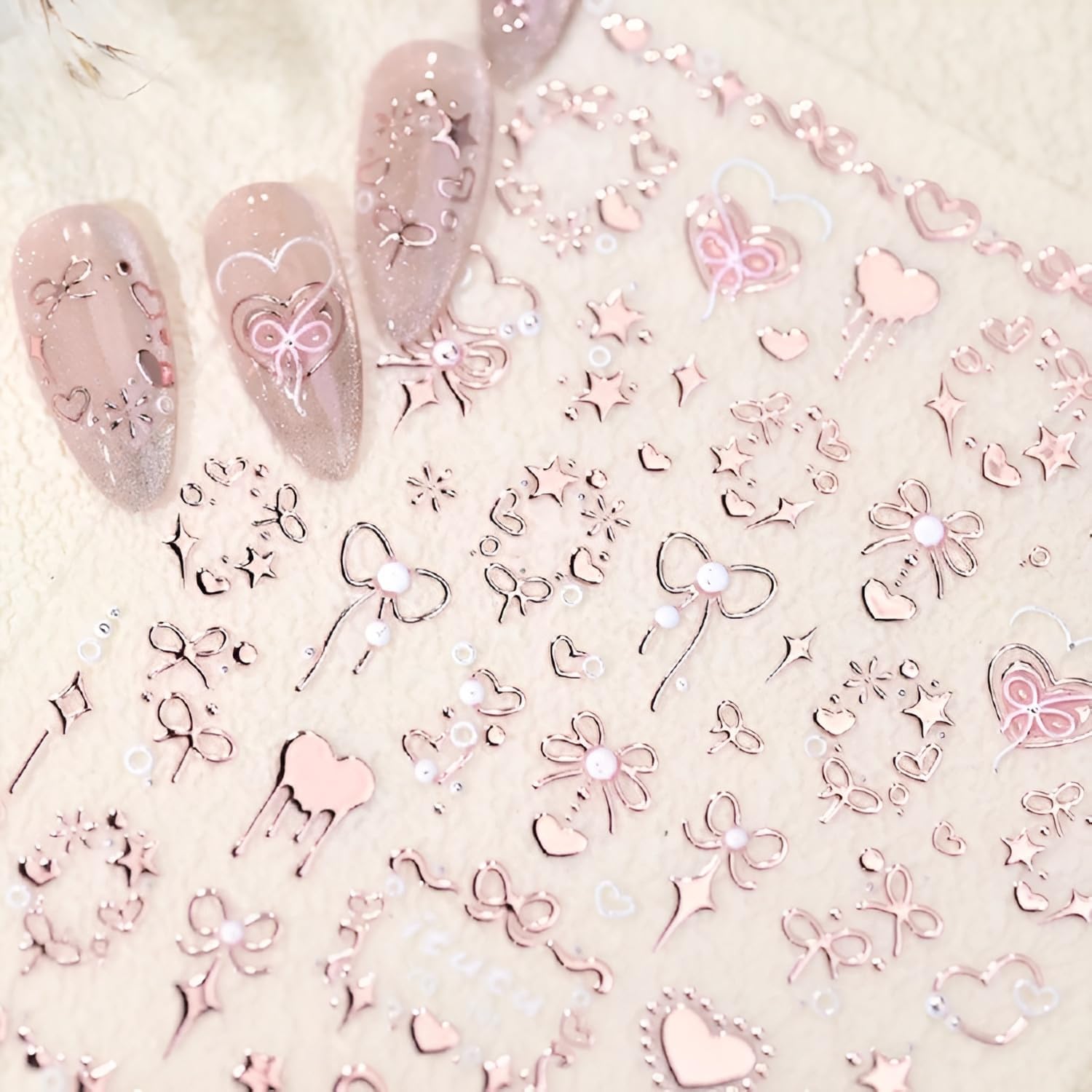 Pink Heart Nail Art Stickers Decals 5D Embossed Star Nail Stickers for Nail Art Pink Bow Nail Decals Valentine Nail Design Cute Nails Supplies for Women
