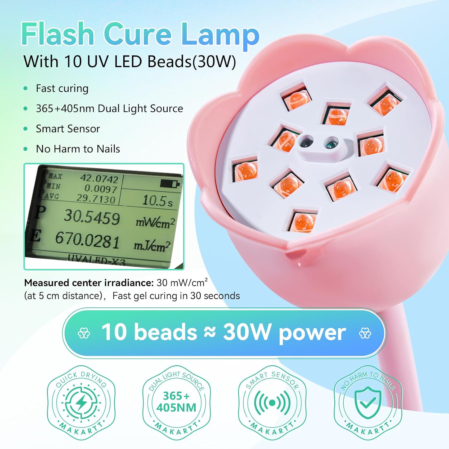- Quick Drying & Efficiency: Makartt pink cordless nail lamp features a 1800mAh rechargeable built-in battery and 10 UV+LED dual light source beads, effectively shortening curing time and curing all types of manicure gels in just 60 seconds (keep within 5cm). Different nail gels have different curing times, such as false nails (10s), gel polish nails (60s), extension gel nails (120s), and nail rhinestone glue (60s).