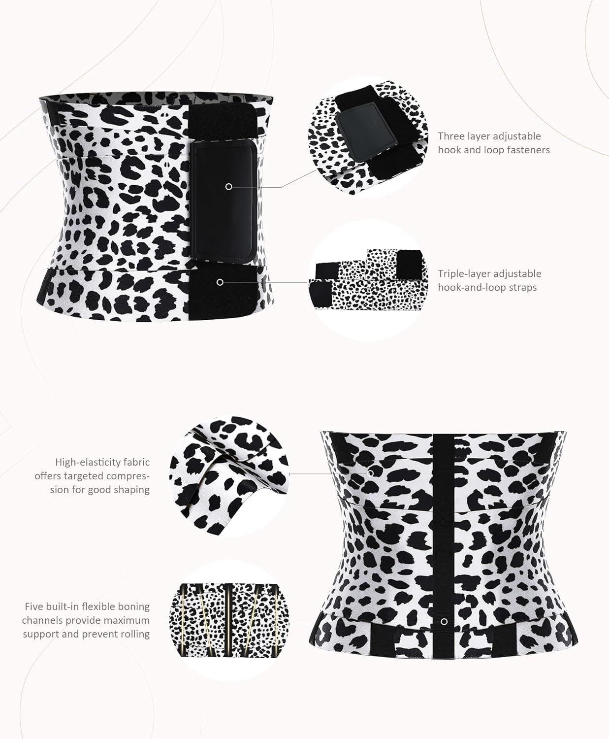 - Inner Support Structure: Our waist trimmer features five flexible plastic stays for enhanced stability and shape retention. The three-layer adjustable hook-and-loop closure system ensures a secure, customized fit.