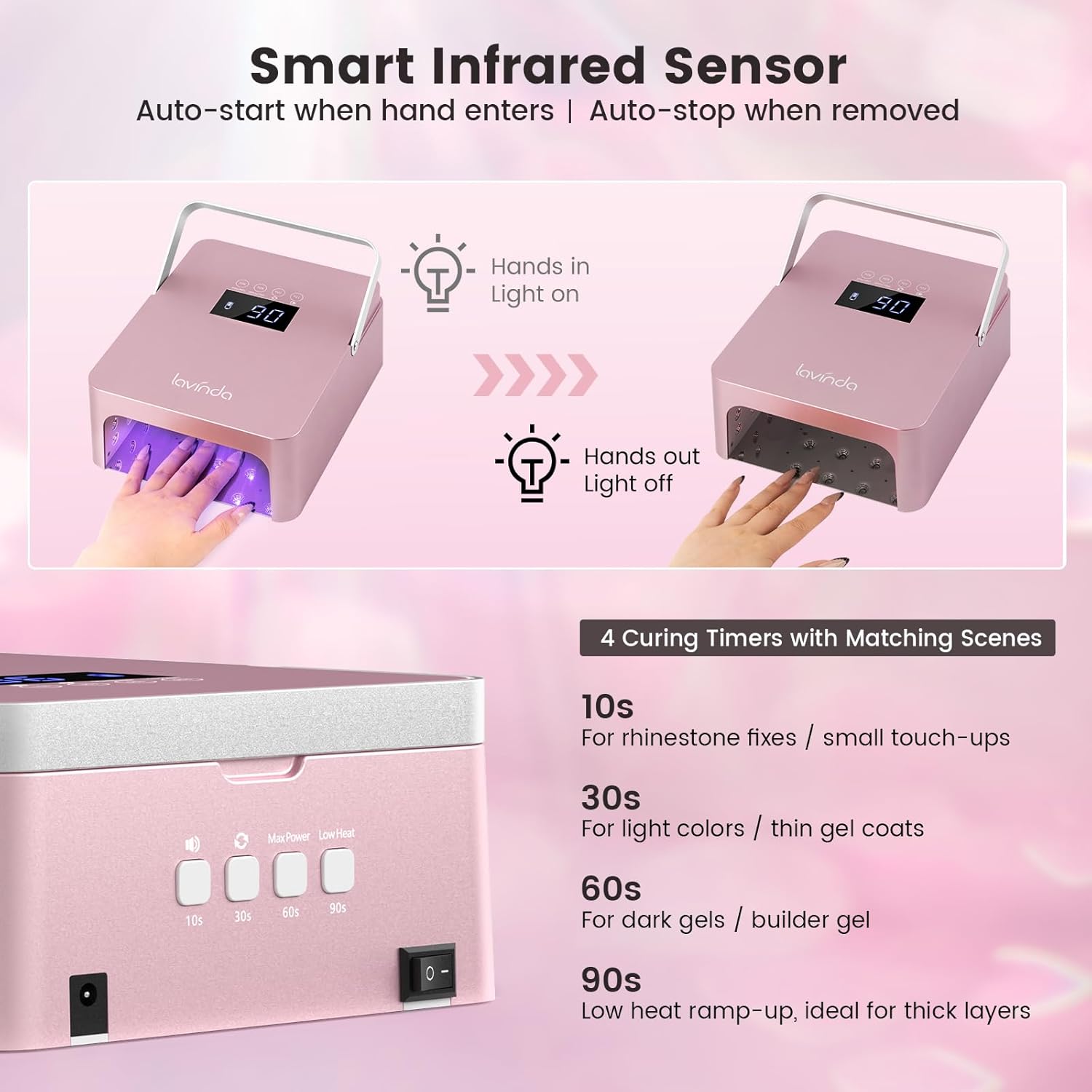 - 【Dual Control – Touch & Button】Unlike ordinary nail lamps, Lavinda X1 uv nail lamp offers dual control: a top touch panel for clients and rear buttons for nail techs. Quick tap for 10s/30s/60s/90s, or long-press (1.5s) to unlock Max Power, Low Heat, mute, or screen rotation—clearly shown on the LCD. Smarter led nail lamp for both salon and home use.