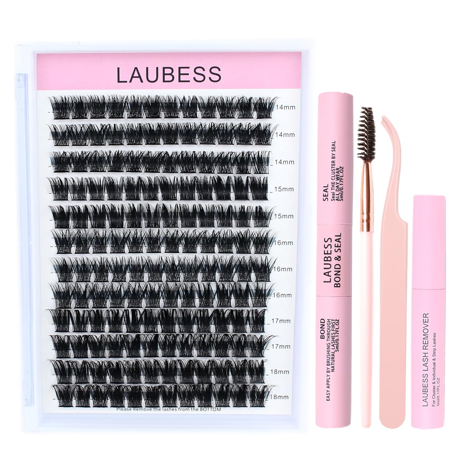 - LAUBESS Lash Clusters Kit: 1 box Lash Clusters, Lash Bond and Seal, Lash Glue Remover, Lash Tweezers and Brush. Everything you need is right here. You can easily apply individual lashes to diy lash extensions look with less time and money, even if newbies.