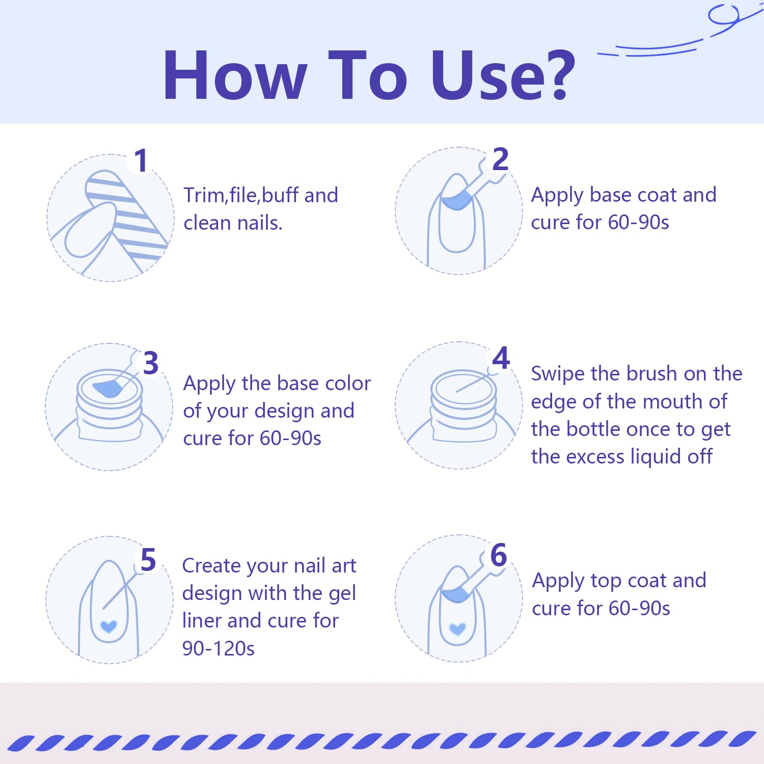 - You’ll Received:10Pcs Nail Art Gel Liner Paint Set.With the built-in thin brush, you don't have to get out your set of brushes for adding details and lines. of nail manicure decoration, especially for nail art manicures. It not only creates a gorgeous momentum for your nails.