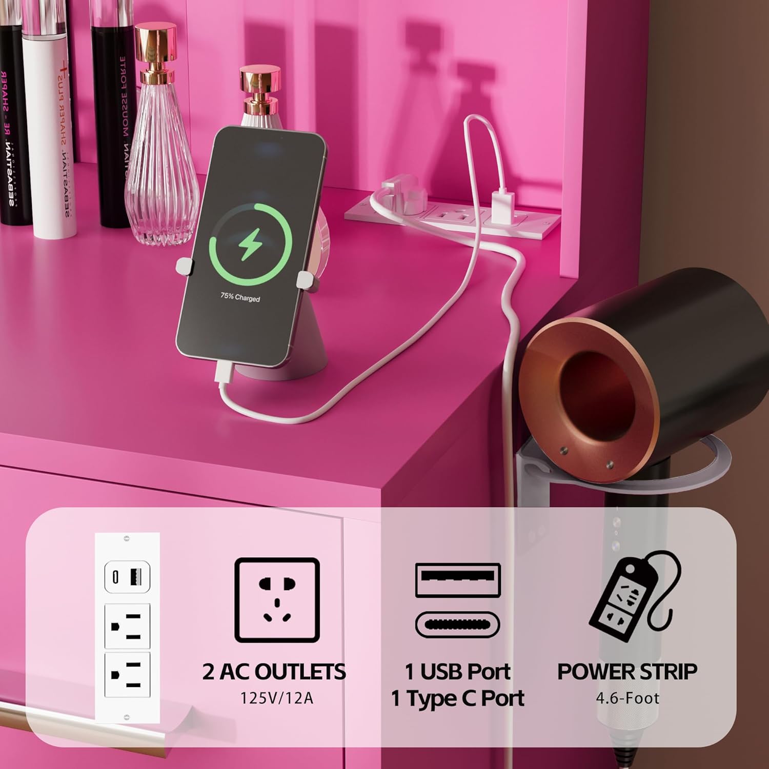 - Power Outlet & Hair Dryer Rack: With 2 AC outlets, 2 USB ports and a hair dryer rack, this vanity desk help you easy access to your hair dryer, cell phone, curling iron and etc. You can do everything at the vanity without having to walk around.