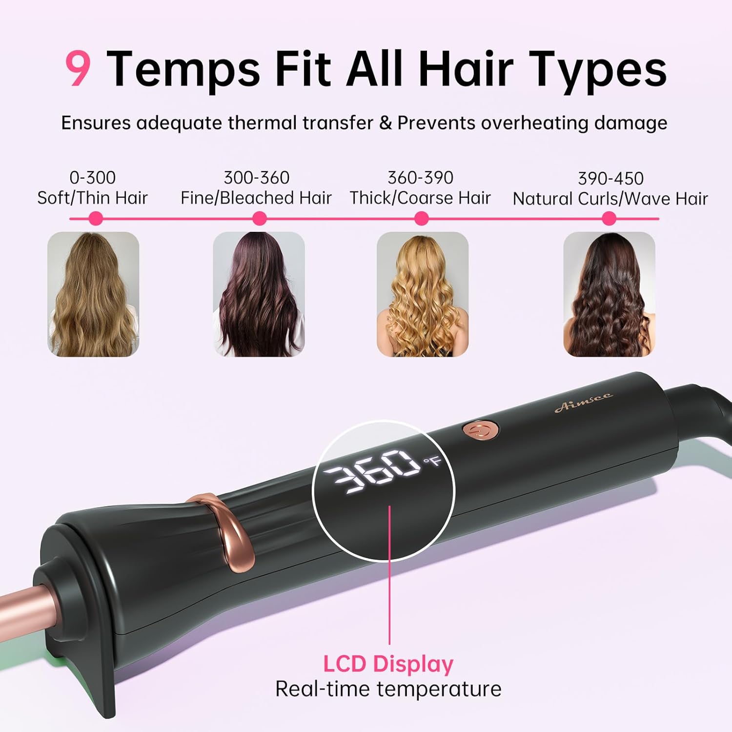 - Flexible Styling with 9 Temp Control: Featuring 9 adjustable temperatures (300-450ยฐF), this skinny curling iron adapts to fine, thick, or heat-sensitive hair. The 2.5m 360ยฐ swivel cord ensures flexibility during styling, making it easy to reach all areas without tangling. Beginners can start at low heat and gradually increase โ match settings to achieve the desired effect, whether that be tight curls or soft, undone waves.