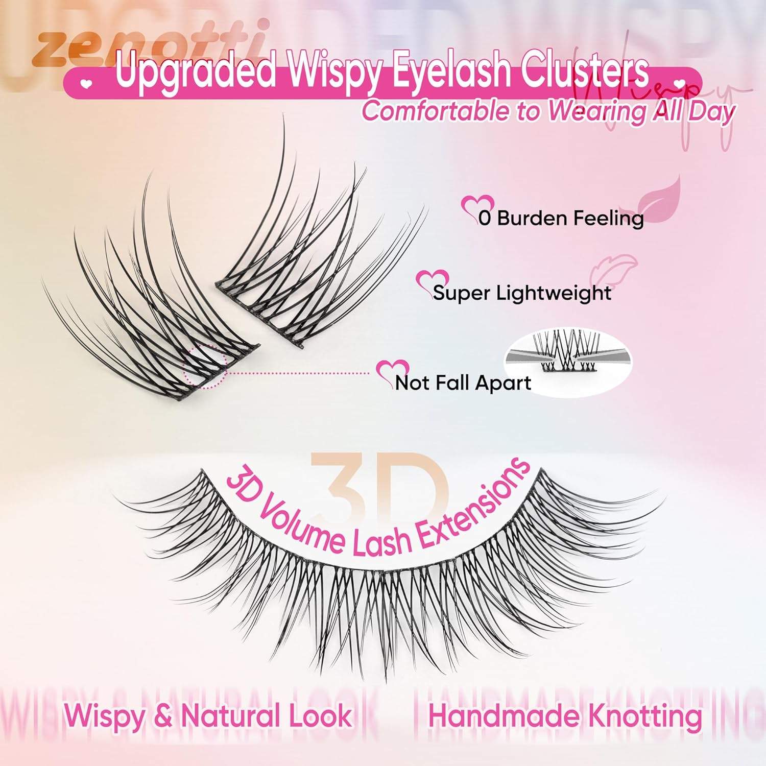 - 【zenotti Wants to Say】 Thank you for choosing zenotti chic lash clusters!We are devoted to providing you chic individual lashes for desirable quality and prioritize your beauty & comfort all the time. So, if you have any concerns about our wispy cluster eyelash extensions, please let us know and we will give you a reply within 24 hours