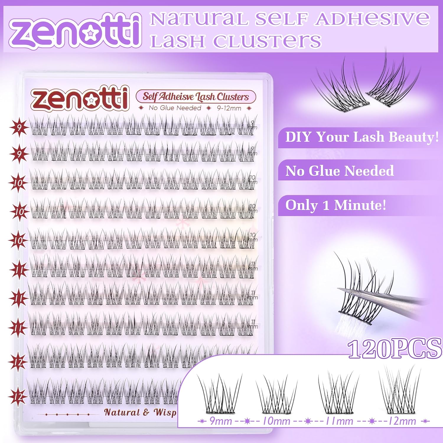 - 【Upgraded Self Adhesive Strips: Bring you All-day Hold】Worried about no glue needed eyelash clusters falling off mid-day? zenotti wispy pre-glued lashes cluster can stay through work, play, and everything in between. Our self adhesive lash extensions is designed for long-lasting wear that withstands humidity, sweat, and even tears, ensuring individual lashes stay securely in place from dawn till dusk.
