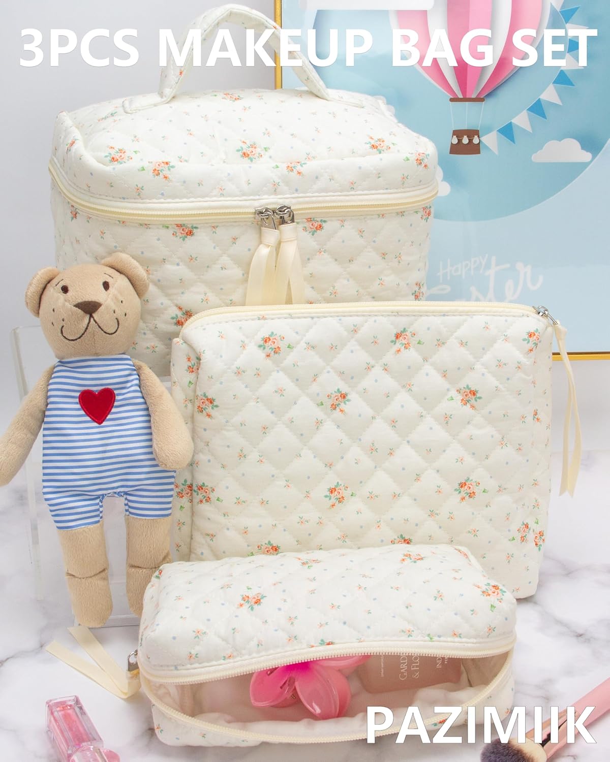 PAZIMIIK 3PCS Makeup Bag SET Large Travel Quilted Zipper Soft Cosmetic Case Pouch for Women Girls Make Up,Floral White