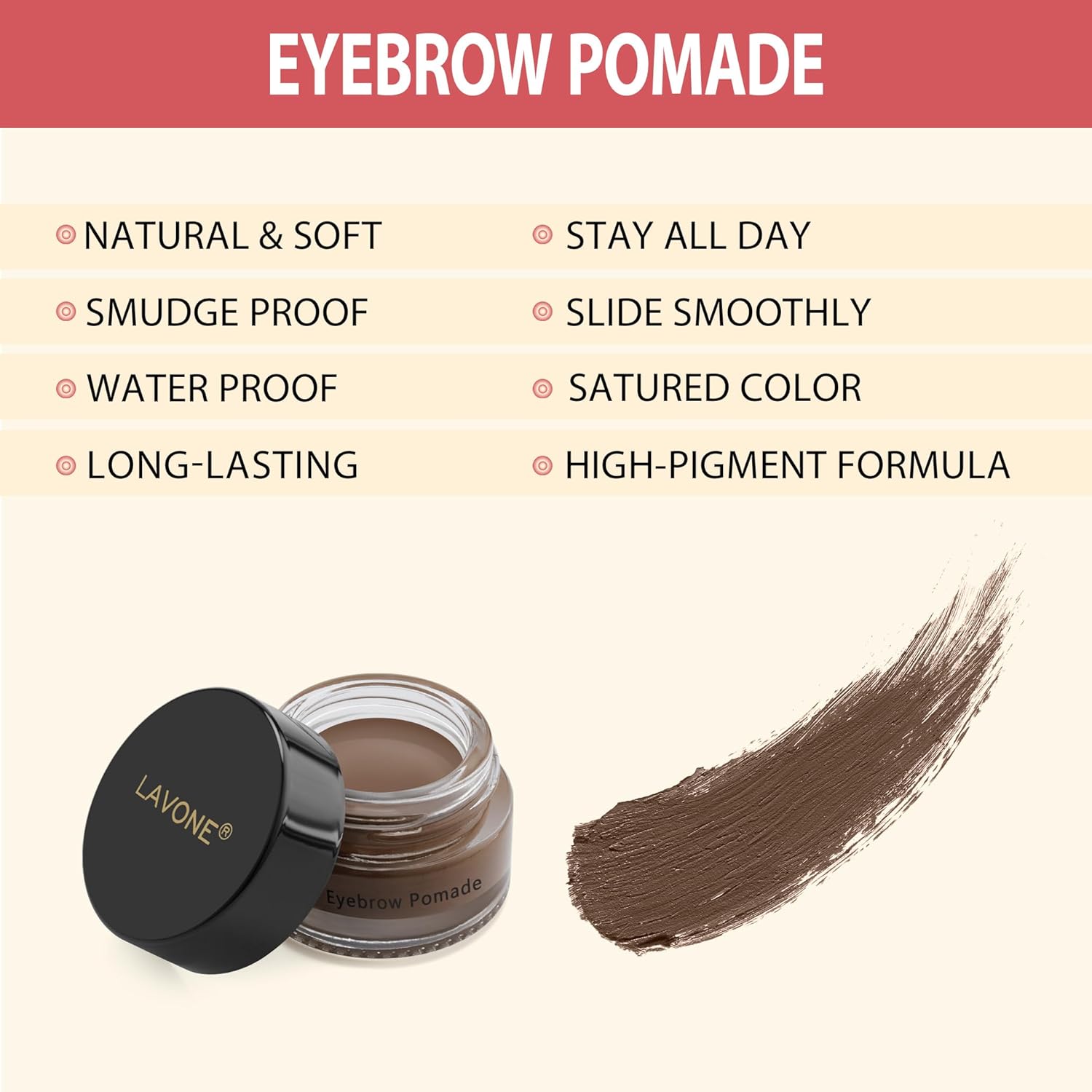 - Waterproof & Smudge-proof Eyebrow Pomade: LAVONE eye brow pomade with highly-pigmented formula keeps your brows firmly in place all day without smudging. It’s long-lasting, smudge-proof and waterproof making them great for swimming, warmer weather or active days.
