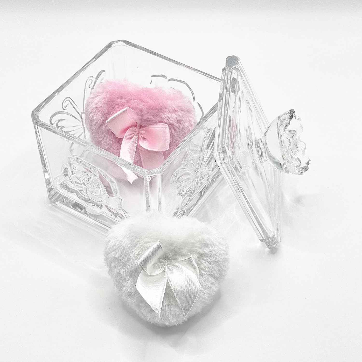 - 【You will get】 1 x Glass Powder Puff Case, reusable one white puff and one pink puff. Transparent glass material, heart-shaped design, both aesthetic and ceremonial, suitable for gift or makeup table decoration. Powder puffs are soft and reusable, wet and dry