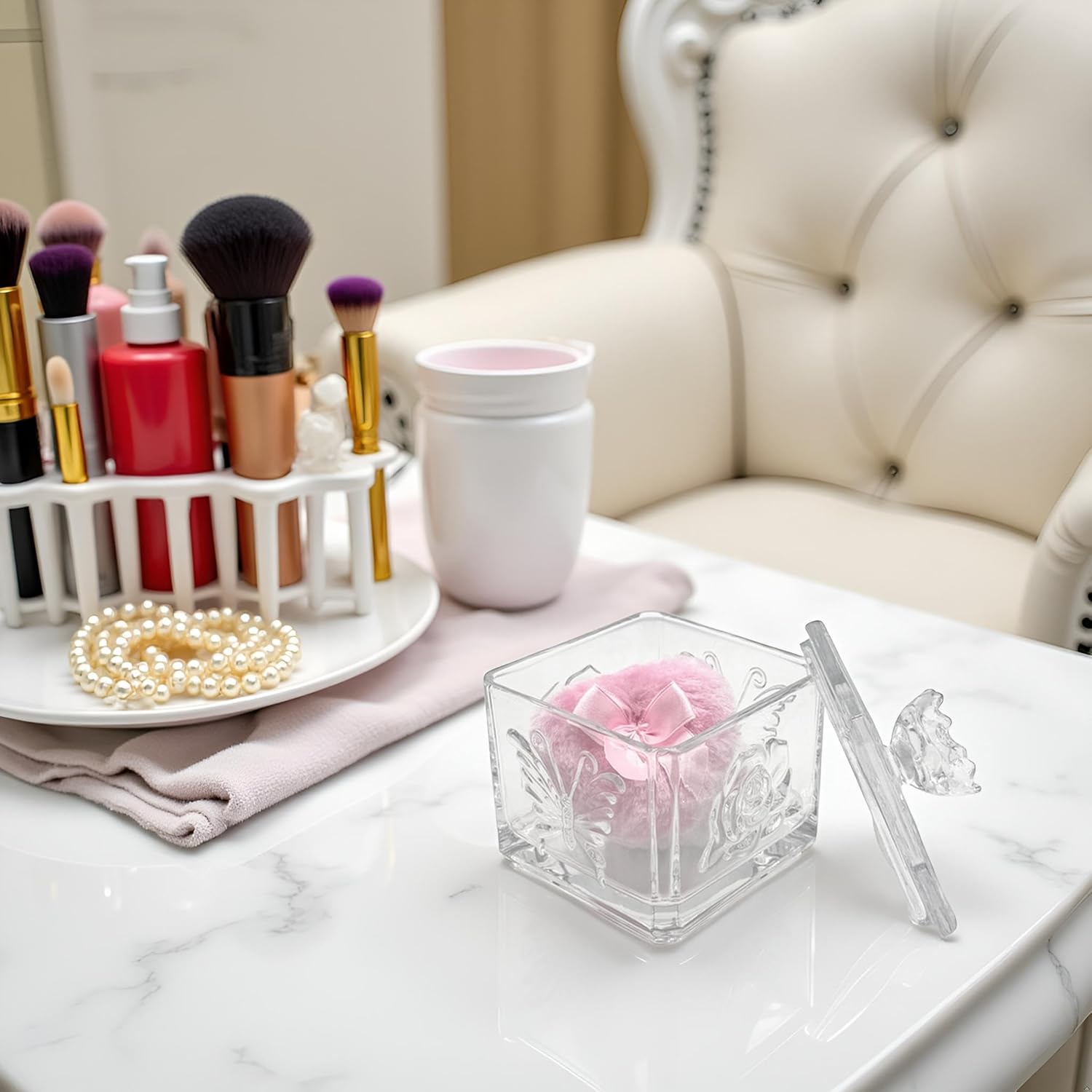 - 【Durable & Easy to Clean】 This glass powder puff case is made of high quality glass material, beautiful and durable. This product is not a sealed jar, easy to clean and daily care, will not take up too much space, but can store your daily trinkets and keep your items organized.