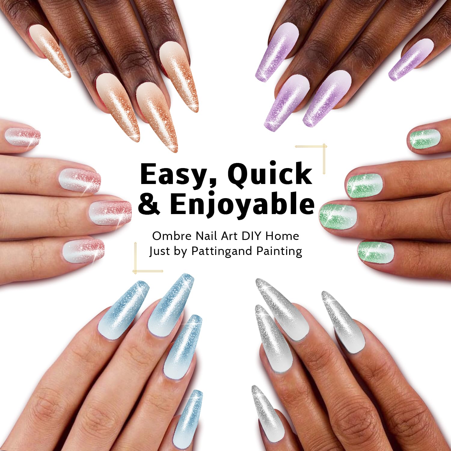 - ăHAVE FUN:ăKarroy ombre nail gel will bring you great fun by self-coloring mixing, sponge-patting painting, brushes drawing & dotting, ect. It's easy, colorful, and wonderful! Package list: 9-Color Palette, 6PCS Nail Art Brushes, 1 Grabber, 100PCS Nail Sponges.
