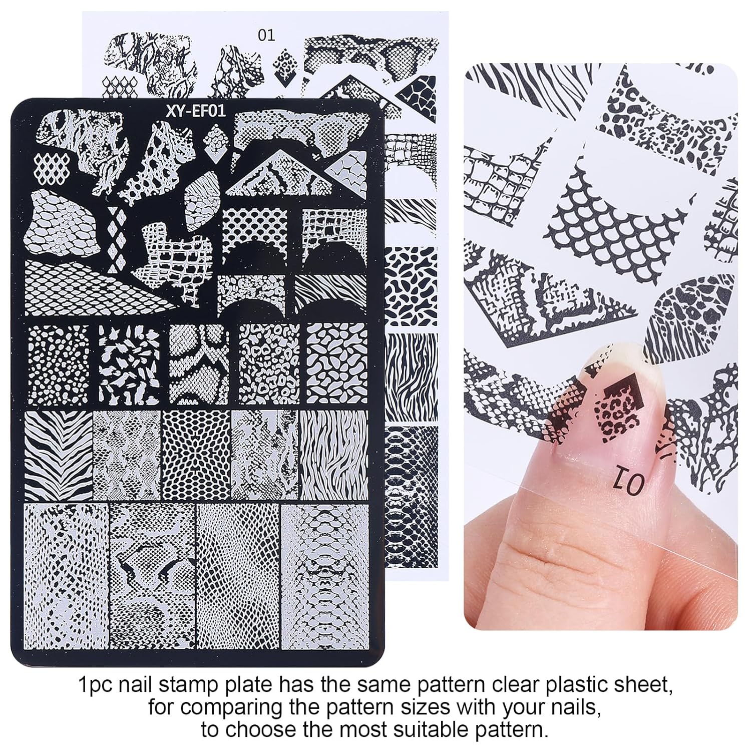 - - Animal Textures Nail Stamp Plates: Set includes 4pcs snake/leopard/zebra print nail art stamping plate, with a stamp, a stamp scraper, and two silicone replacement heads. Beginners can use this nail supplies set to easily create a variety of animals patterns nails.