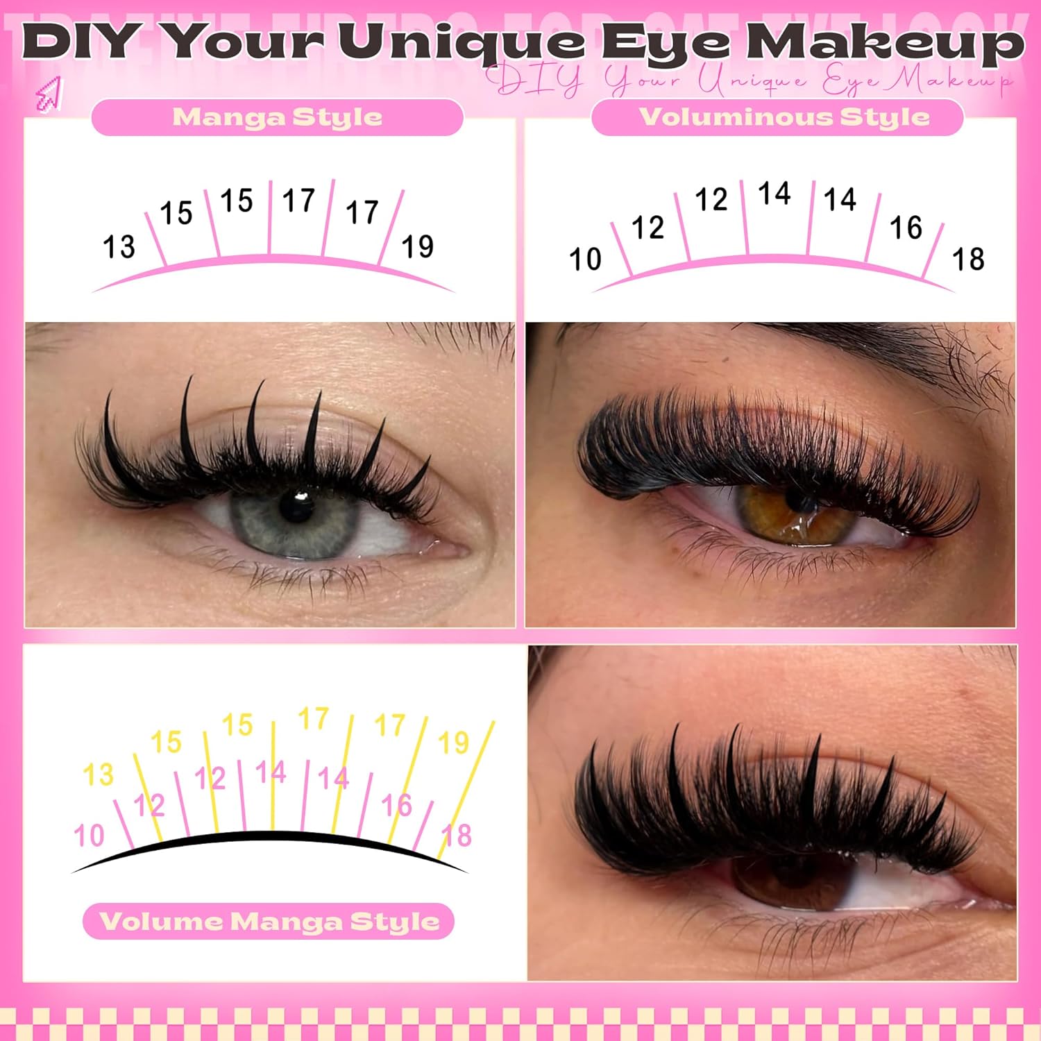 - Exploring Different Styles:This individual lashes features 13-19mm spiky lashes and 10-18mm fluffier lash clusters that you can combine different eyelash clusters lengths to DIY manga style and various dramatic eye makeup at home, which can significantly refine the eye shape and make the makeup more dazzling