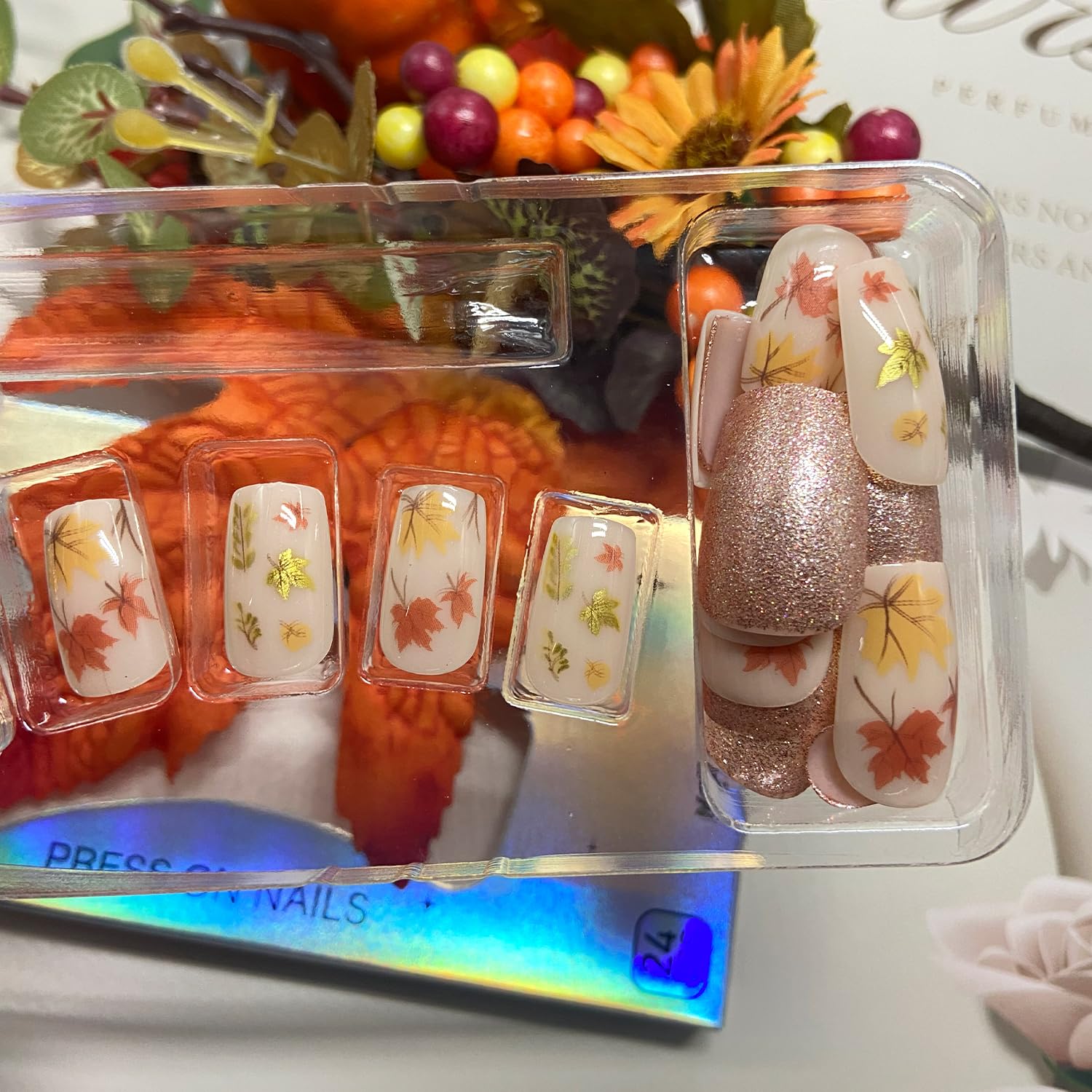 - Package: You'll get 24 fall maple leaf fake nails in 12 sizes. 1 mini nail file, 1 small wooden stick, 1 piece of adhesive tab glue. You can safely choose a fake nail that fits your finger size and DIY your desired nail shape